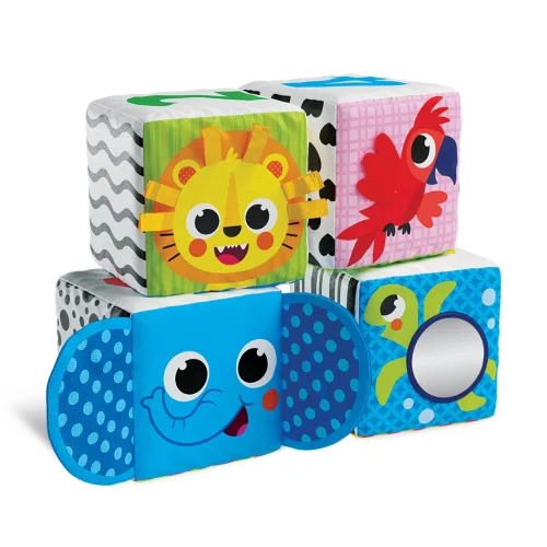 Οι κύβοι περιλαμβάνουν ευχάριστες στην αφή λεπτομέρειες, όπως καθρεφτάκι και κορδέλες, οι οποίες προσφέρουν ποικίλα αισθητηριακά ερεθίσματα.